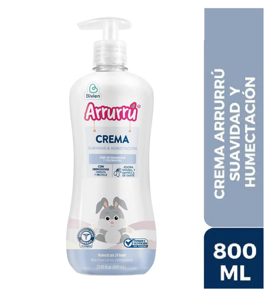 Crema Arrurru suavidad y humectación Nutre y protege la delicada piel del bebé, hidratándola hasta por 24 horas. Con textura ligera y de rápida absorción. Modo de uso Aplica una pequeña cantidad de la crema en la mano y desliza en todo el cuerpo de tu bebé con un suave y estimulante masaje después del baño.