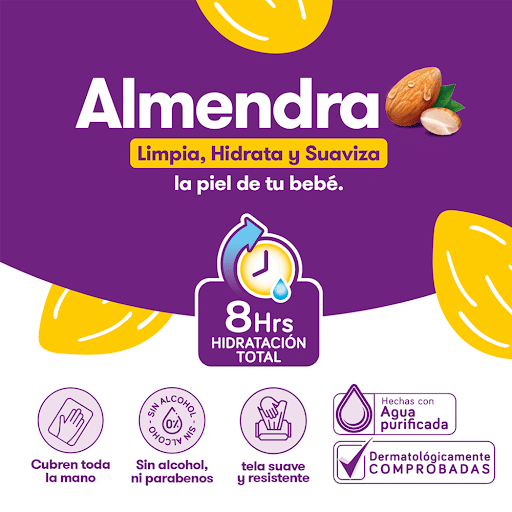 Nutre la piel mientras limpias suavemente al bebé. Con aceite de almendras que previene la resequedad y las irritaciones.